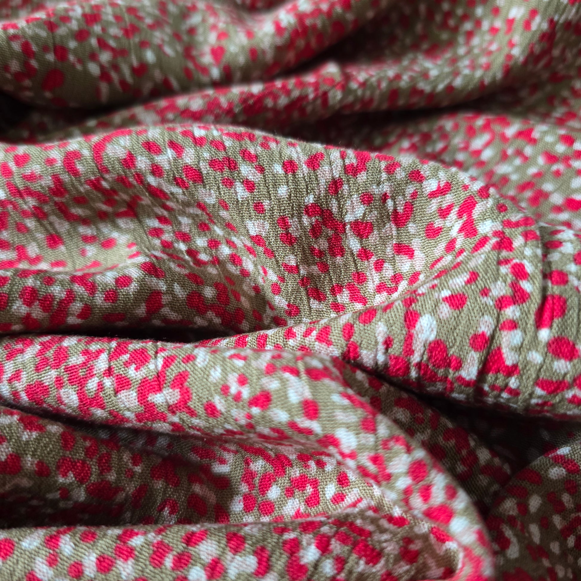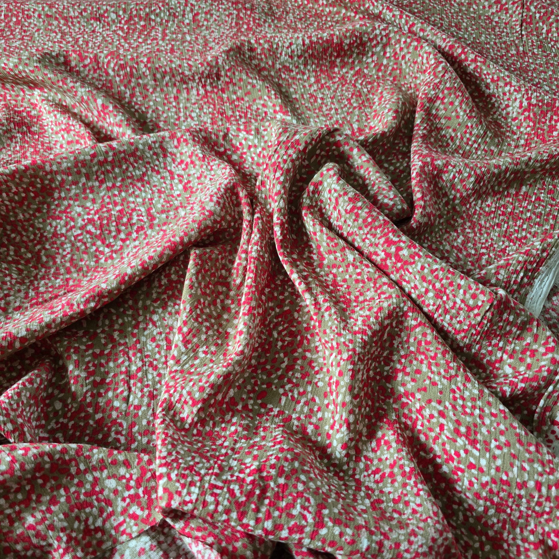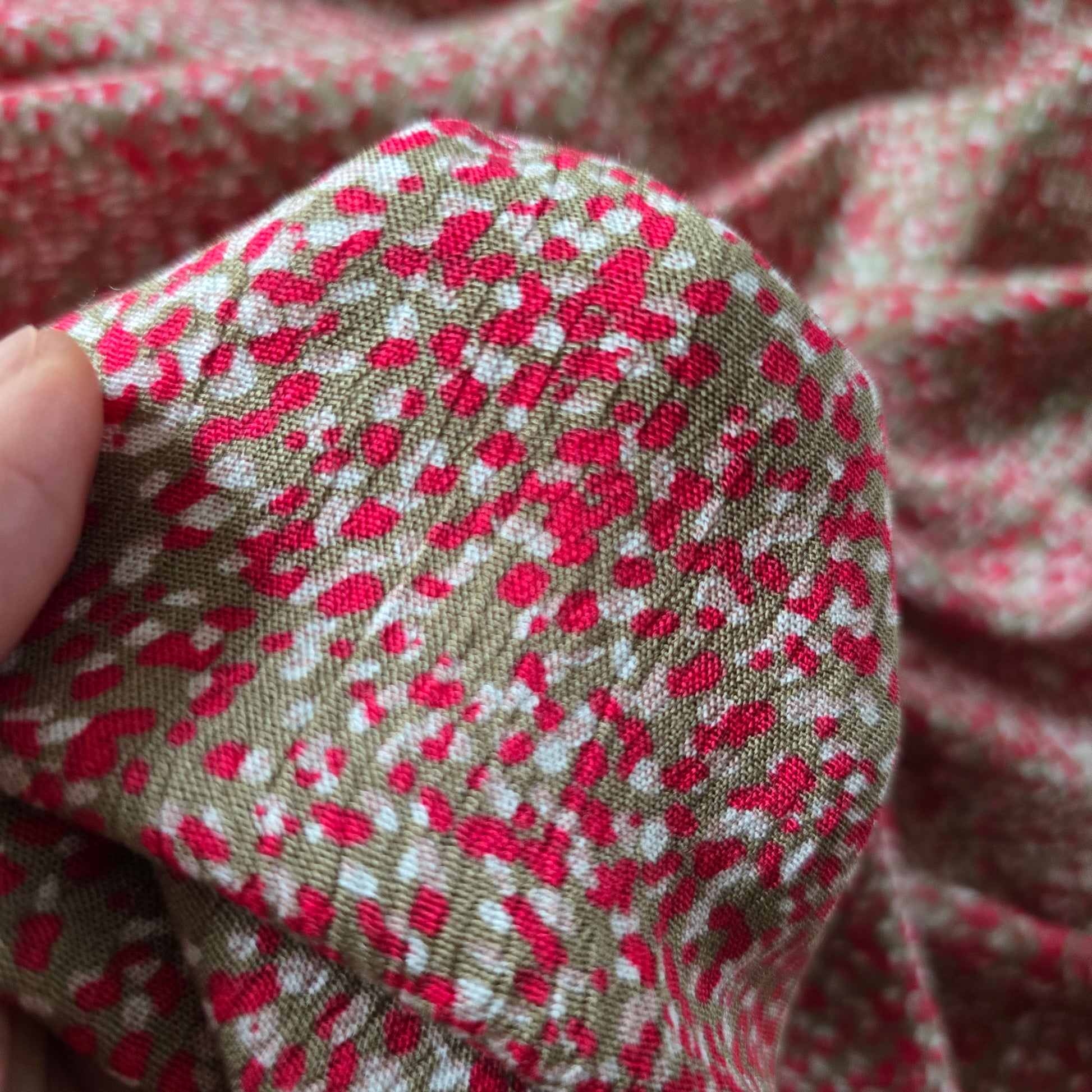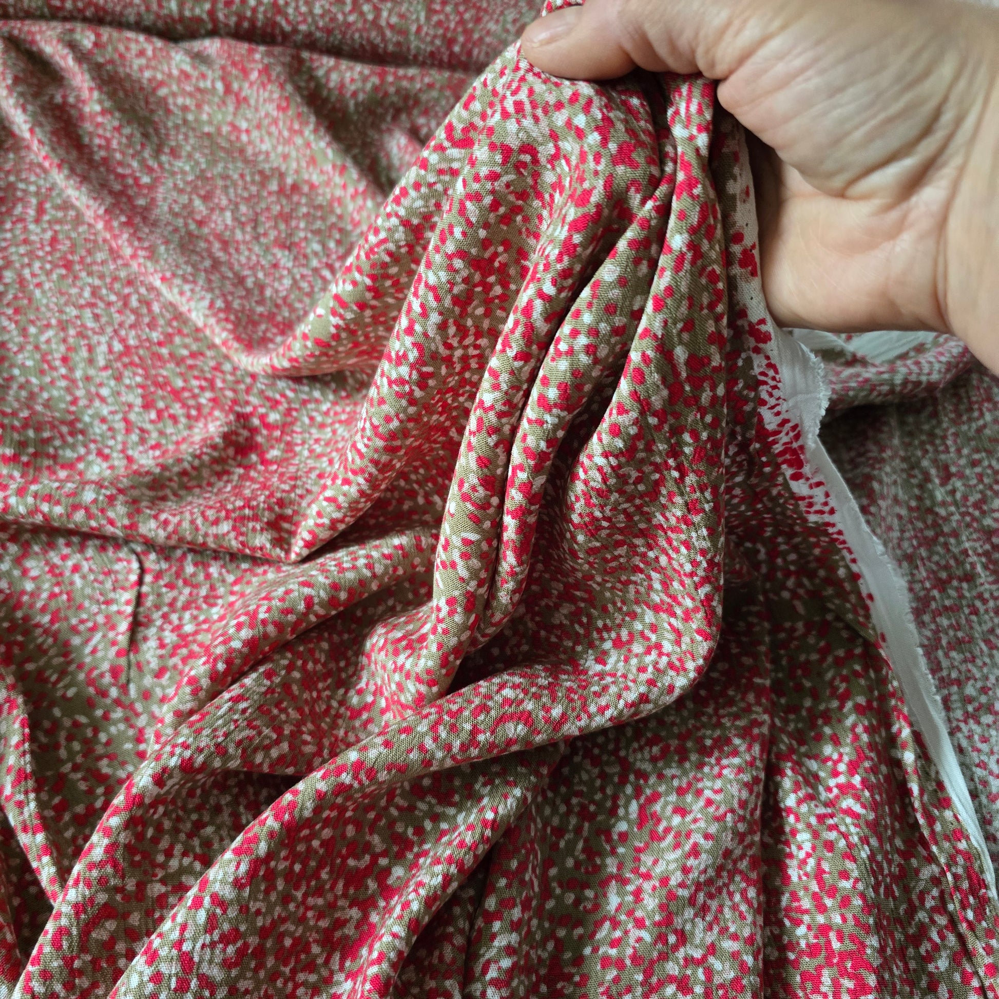 Ein leichter, luftiger Viskosestoff mit schöner Borkenkrepp-Struktur und einem angenehmen Fall. Die dezente Farbe in taupe wird durch feine weiße und rote Sprenkel aufgelockert und verleiht dem Stoff eine lebendige, fröhliche, aber dennoch elegante Optik.