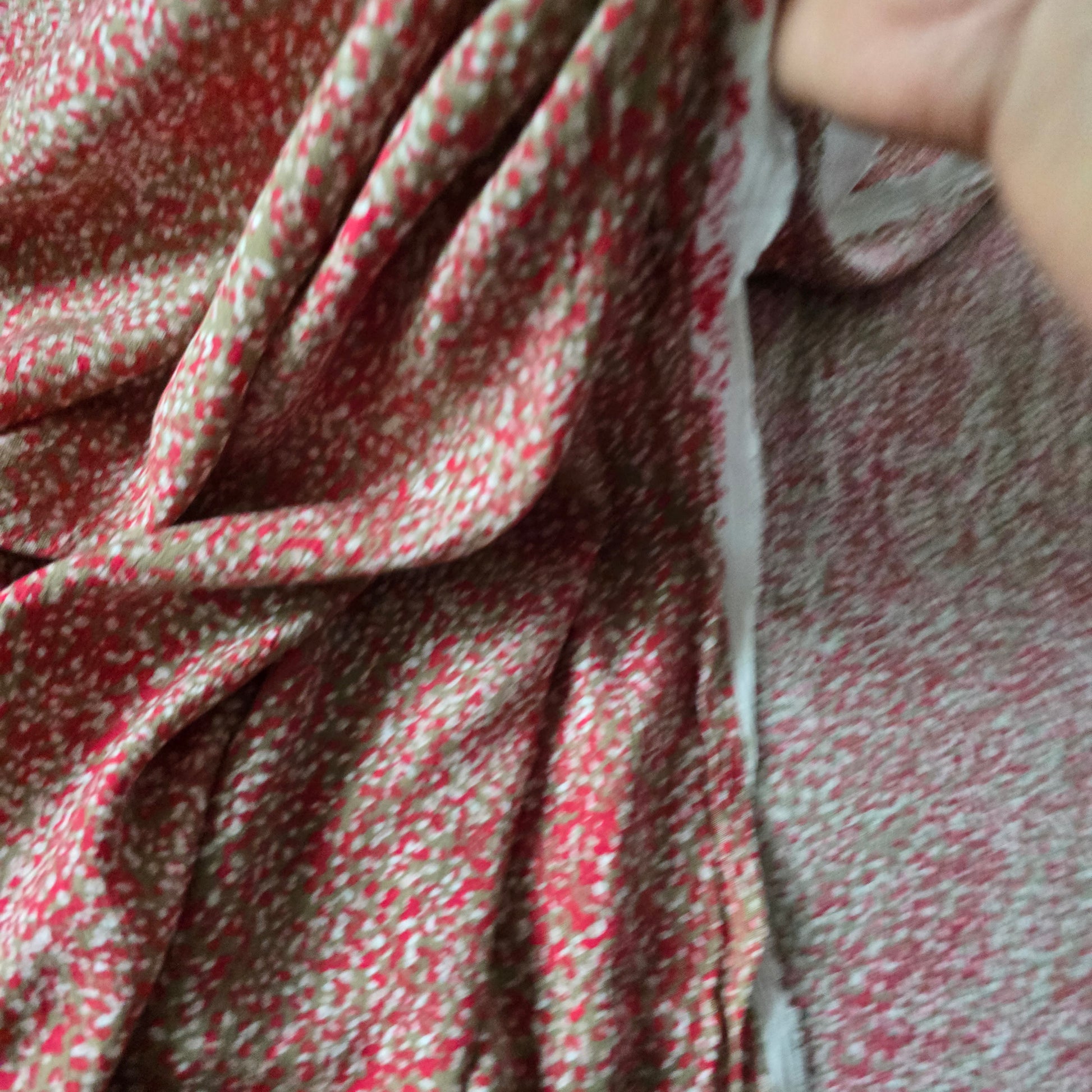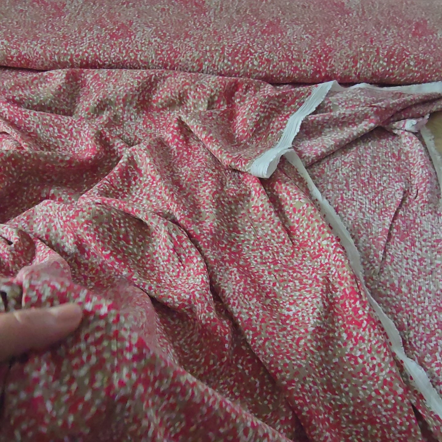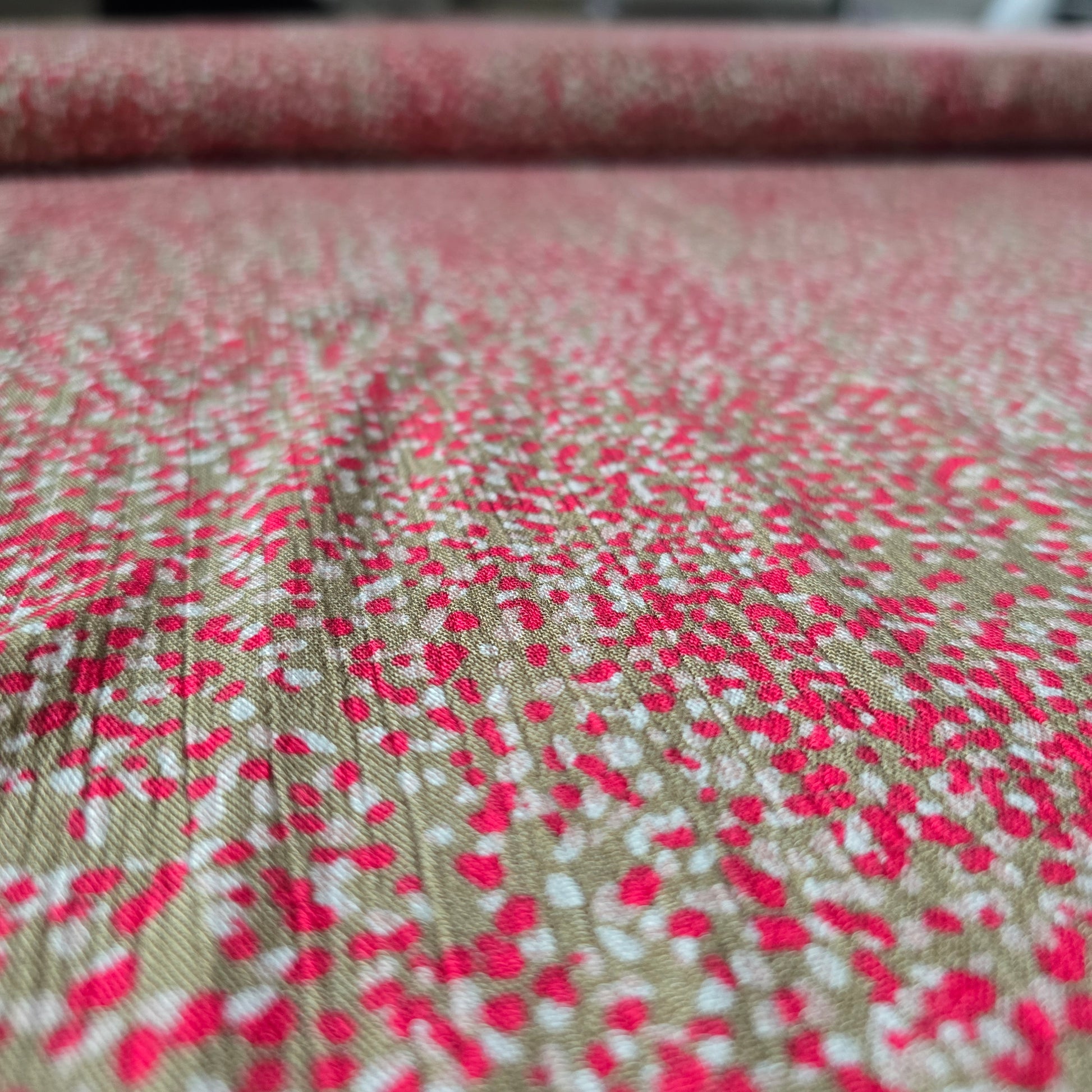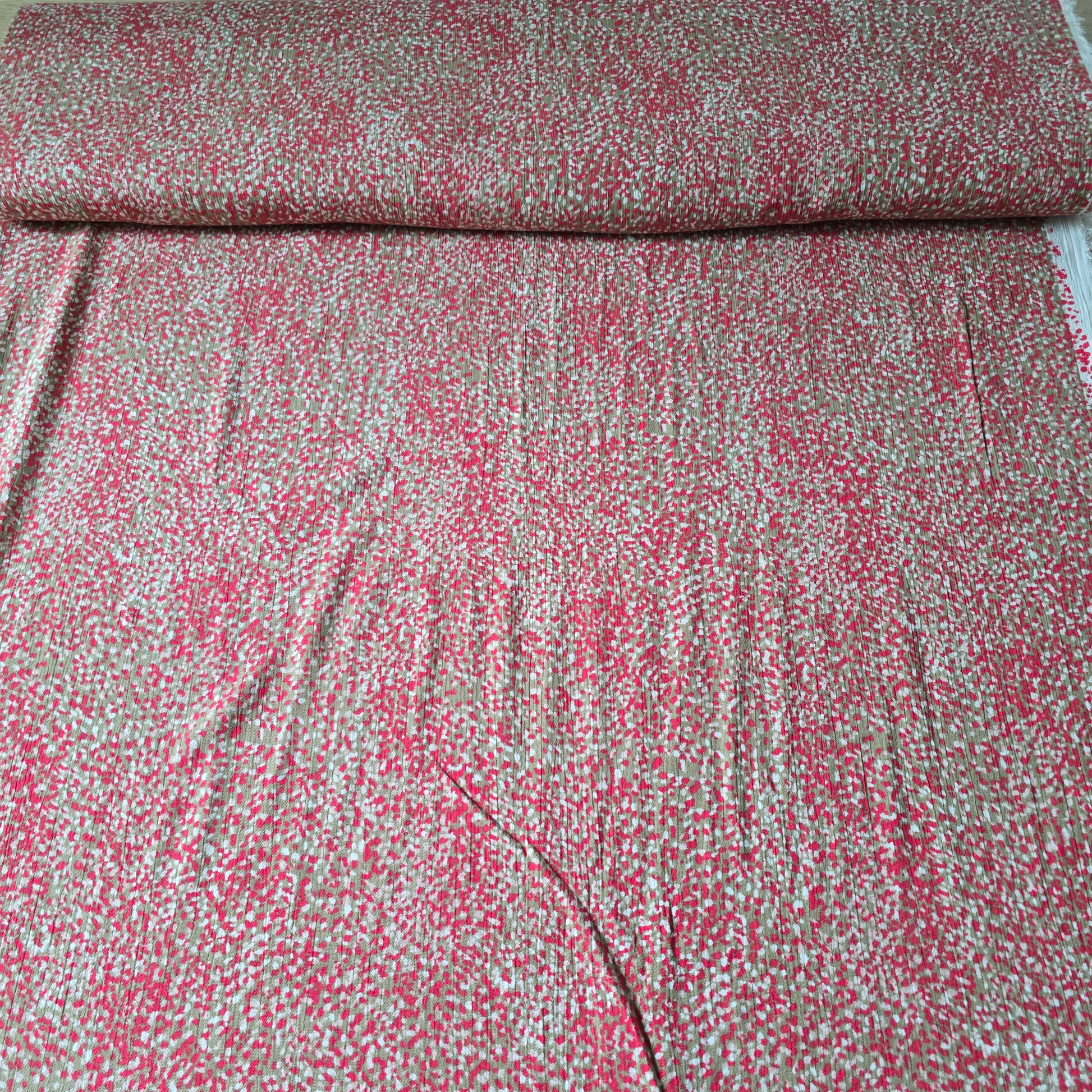 Ein leichter, luftiger Viskosestoff mit schöner Borkenkrepp-Struktur und einem angenehmen Fall. Die dezente Farbe in taupe wird durch feine weiße und rote Sprenkel aufgelockert und verleiht dem Stoff eine lebendige, fröhliche, aber dennoch elegante Optik.