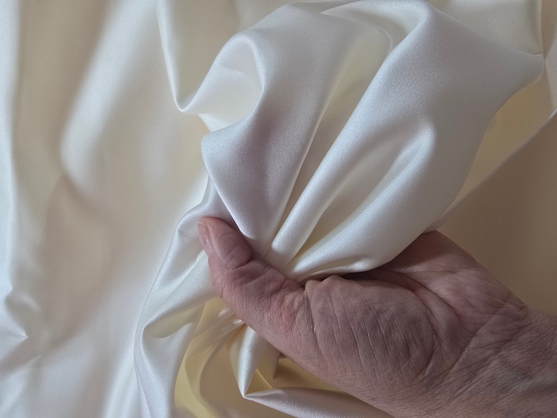 Edler und eleganter Brautsatin, ähnlich wie Brautsatin klassisch, aber etwas fester und minimal schwerer. Dieser hochwertige Stoff besticht durch seine seidige, halbglänzende Oberfläche, die im Licht nur dezent schimmert.