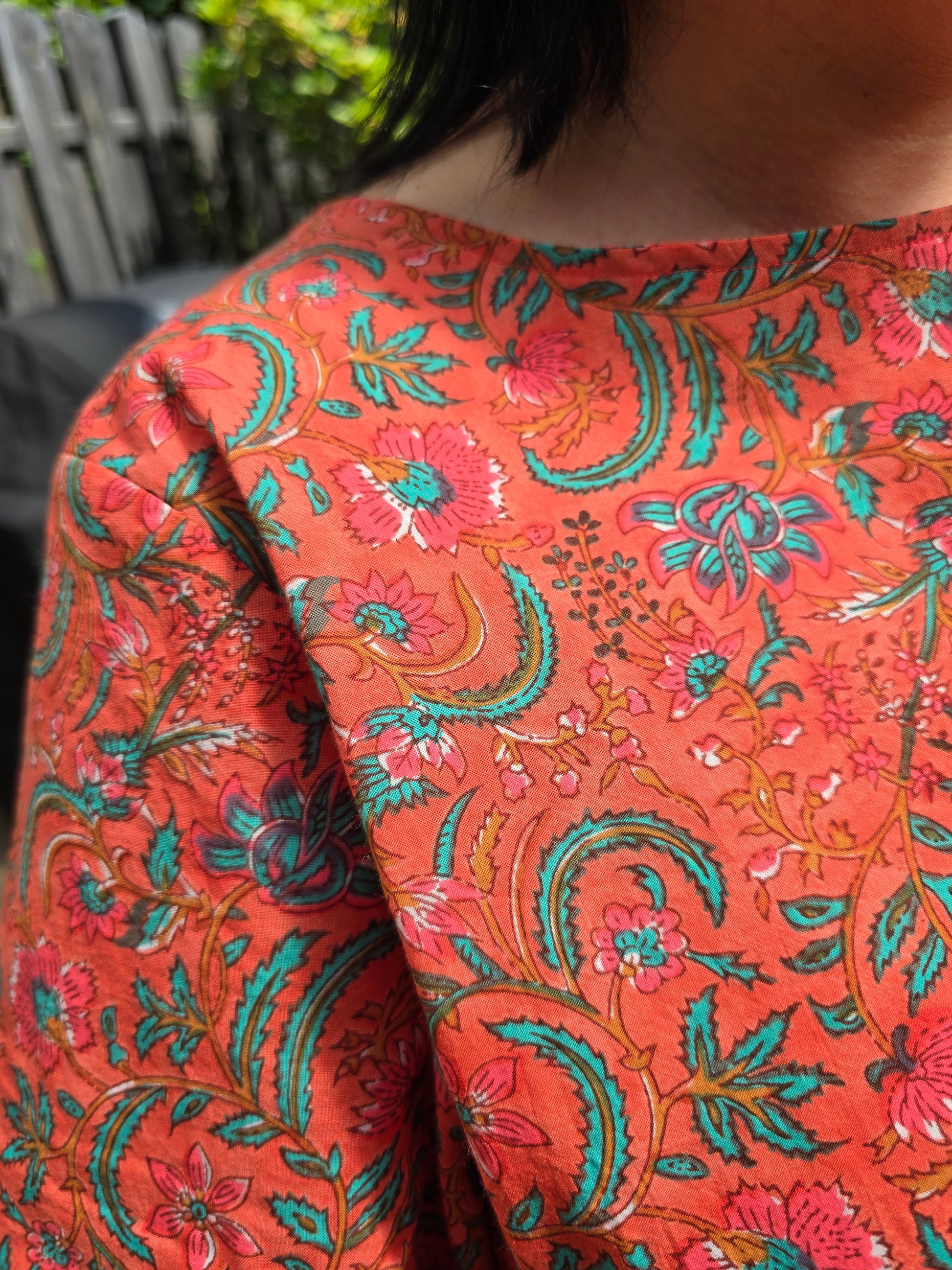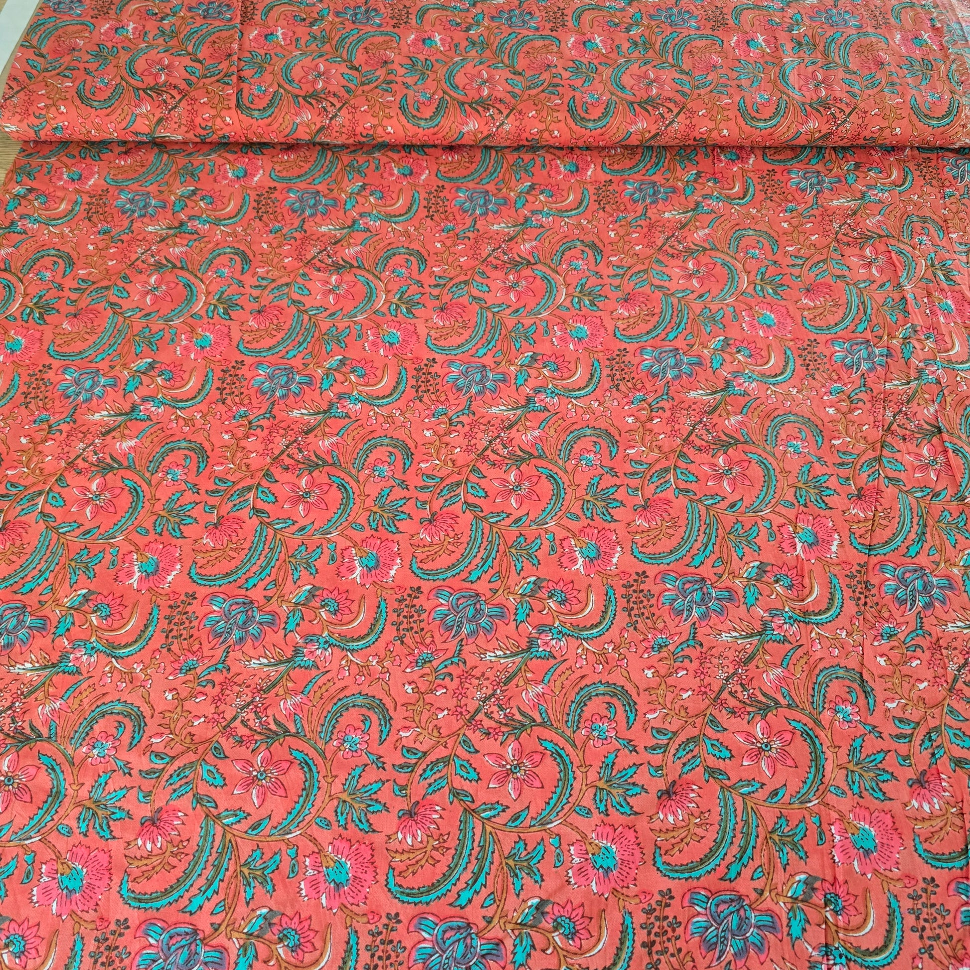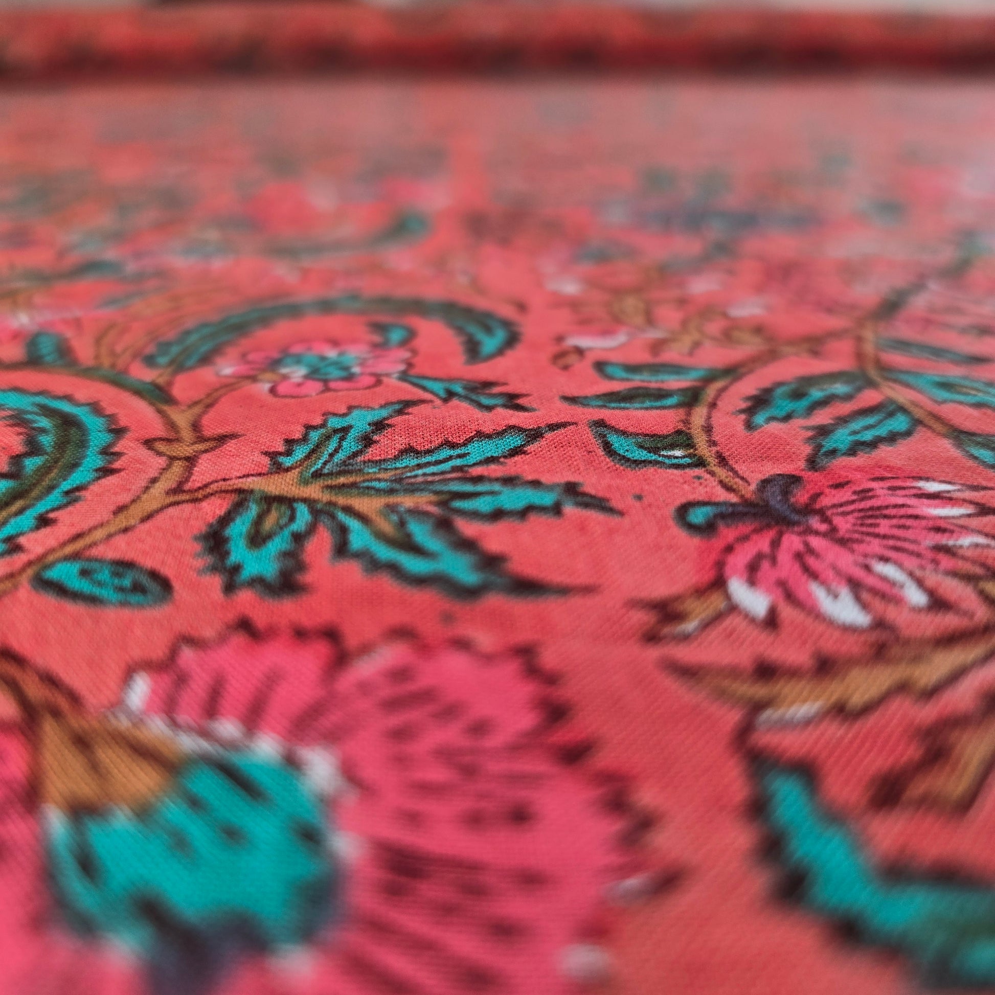 Ein leichter, luftiger Baumwoll-Voile in schöner Korallefarbe mit zartem Blumenmuster in Grün und Rot. Der Stoff hat einen angenehmen, weichen Fall und eignet sich hervorragend für luftige Sommermode.