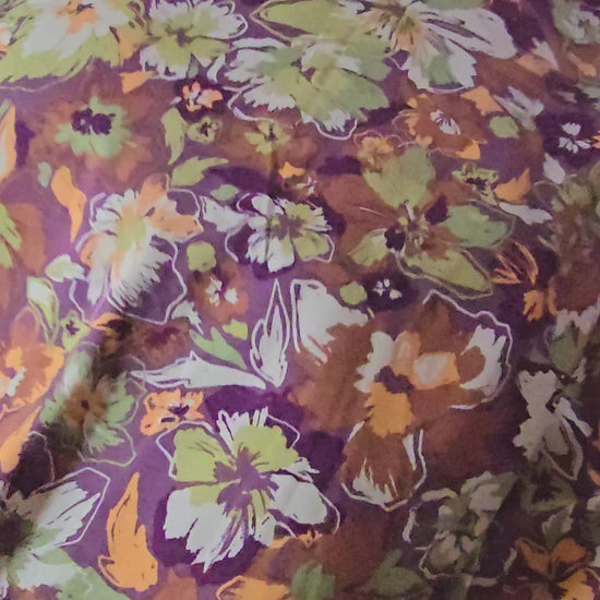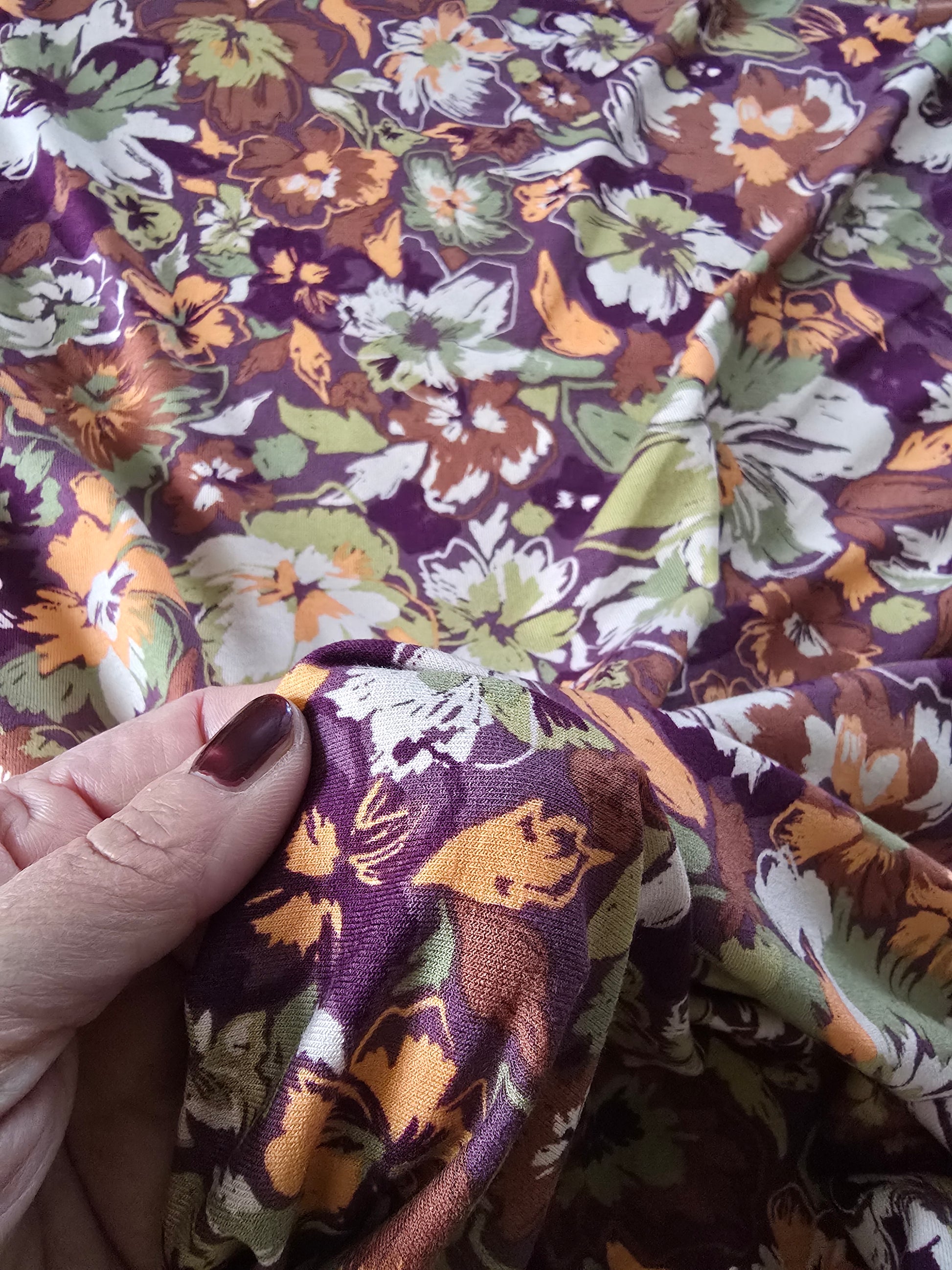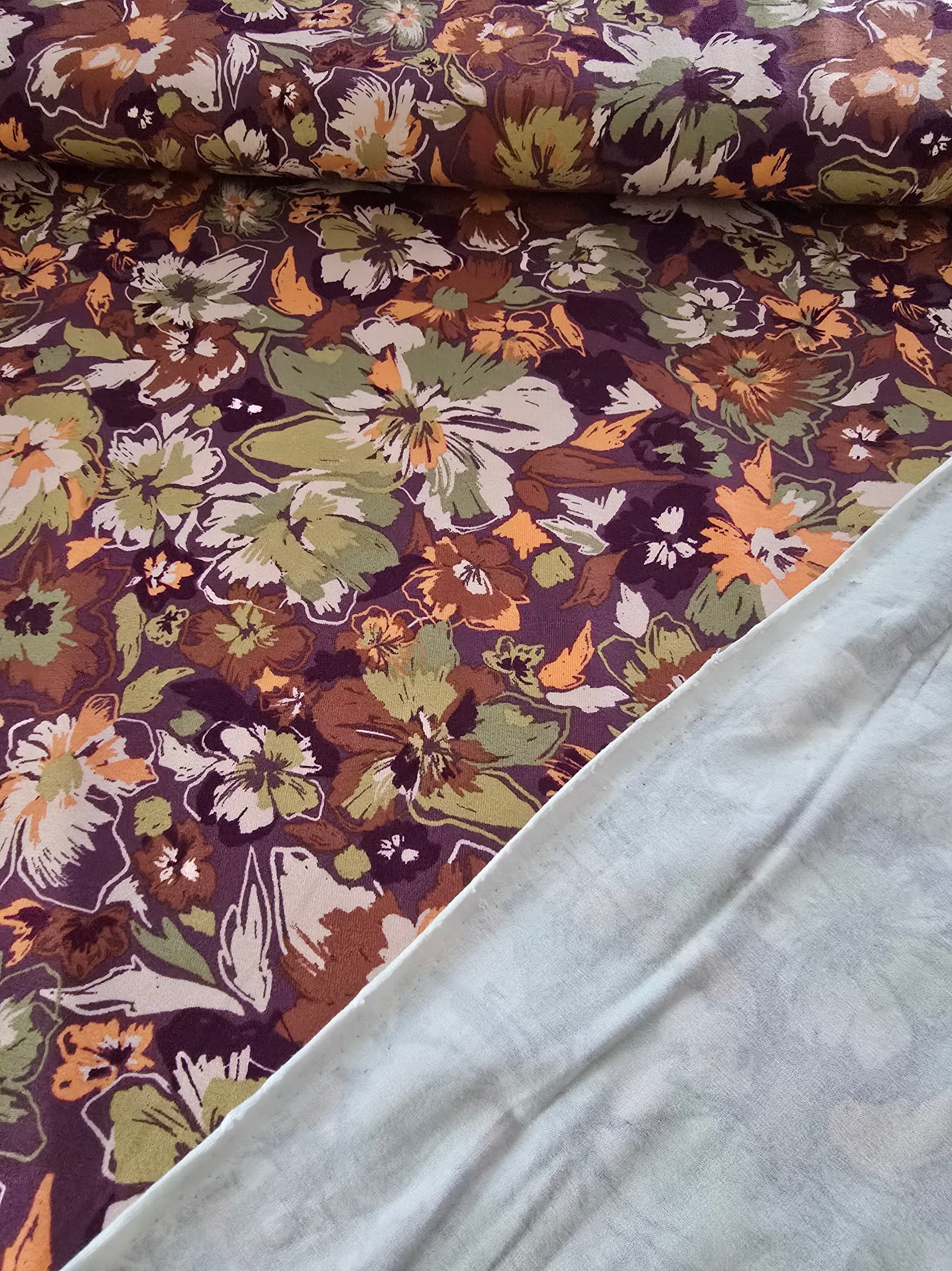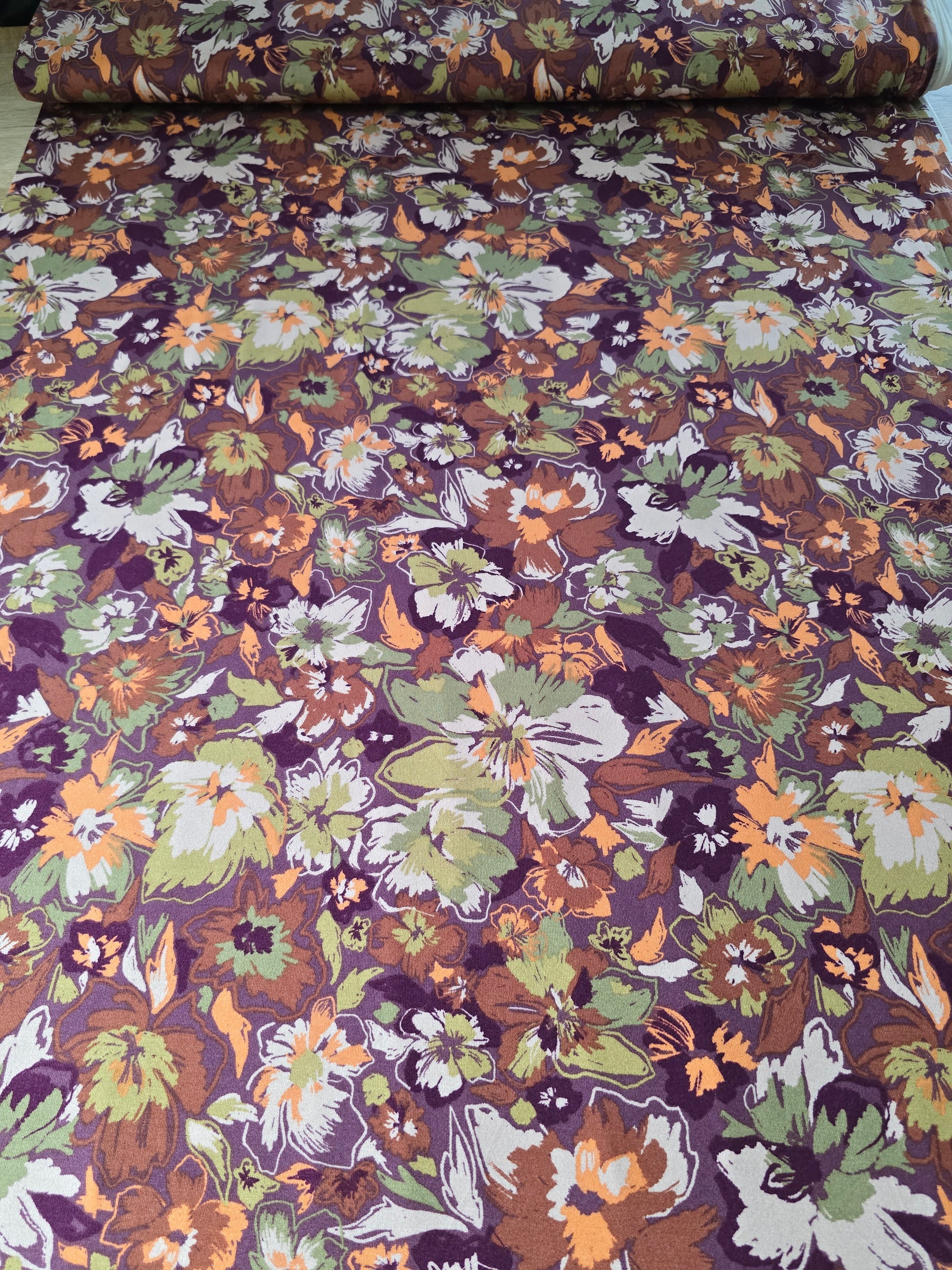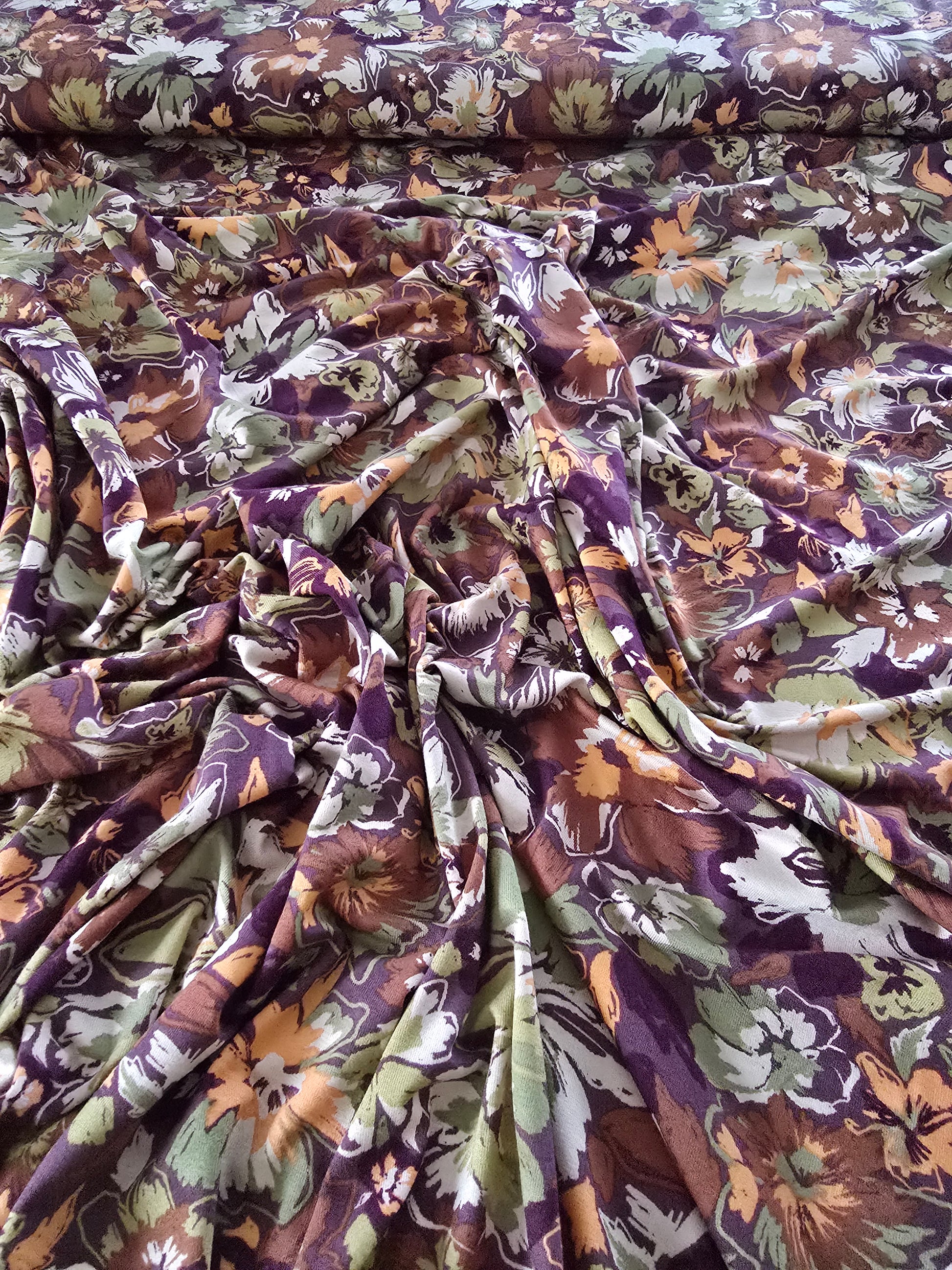 Wunderschöner Viskose Interlock Jersey (Vortex Jersey) mit herbstlichem Blumenmuster in warmen Tönen von Mauve/ Aubergine, Goldbraun/Rost und gedeckten Grüntönen. Der elastische, anschmiegsame Jersey-Stoff ist gleichzeitig formstabil und angenehm weich im Griff, perfekt für alle herbstlich gemütliche Nähprojekte. Ein hochwertiger Viskosejersey, der die warme Stimmung des Herbstes einfängt.